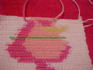NA SETIMA CARREIRA, NO 15 º PONTO A PARTIR DA AGULHA, TOCAR PARA O FIO ROSA FORTE, FAZER 7 PONTOS BAIXOS, E VOLTE A UTILIZAR O FIO BRANCO ATÉ O FINAL DA CARREIRA.